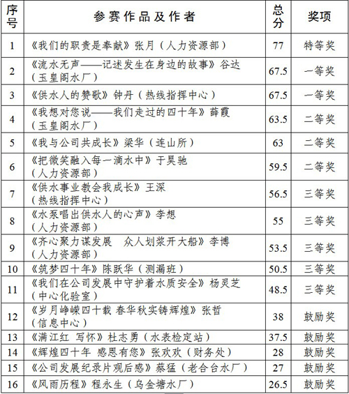 本次評選,公司本著公平、公正原則,特聘請5位來自《葫蘆島日報》、《葫蘆島晚報》副總編及記者評委對無署名的16篇作品進行評審,最高分值16分,分差為整分或半分(0.5分),每篇作品最后得分為5位評委評分之和。經統計分數,評選出特等獎1名(獎金500元),一等獎2名(獎金300元),二等獎3名(獎金200元),三等獎5名(獎金100元),鼓勵獎5名(獎金50元),公司對征文比賽獲獎人員予以通報表彰。
