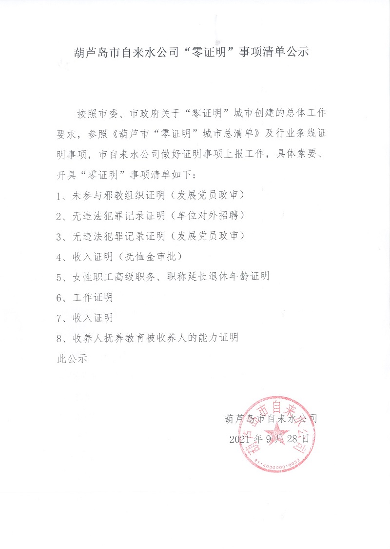 葫蘆島市自來水公司“零證明”事項清單公示