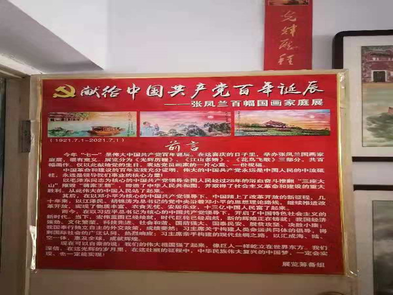 畫展作品由我市退休干部張青山、張鳳蘭夫婦潛心創作,專門在自己家中展出,分為《光輝歷程》《江山多嬌》《花鳥飛歌》三部分,共百幅作品,重現紅色歷史,展示了中國共產黨百年奮斗歷程,同時展出祖國大美河山及家鄉風景作品,贊頌了幸福美好生活的和諧安寧。