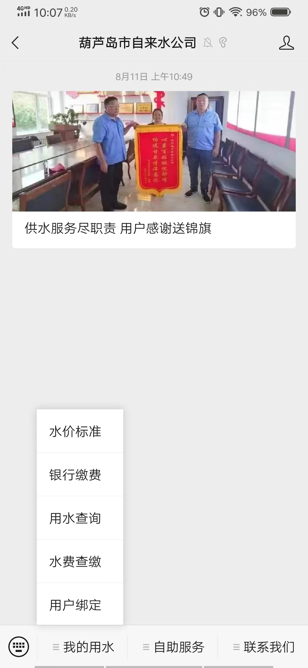 進入葫蘆島市自來水公司公眾號—點擊我的用水—點擊水費查繳