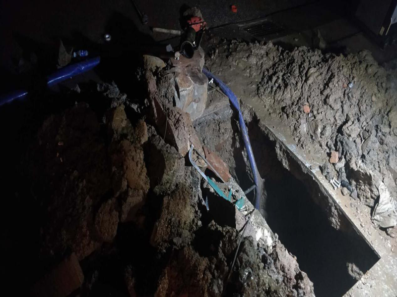 6月1日晚9點(diǎn),營(yíng)業(yè)二分公司接到維修工單,反映龍灣花園別墅區(qū)有幾戶家中無(wú)水,維修人員張井軍、齊德仁、曹哲禎迅速趕往現(xiàn)場(chǎng),測(cè)漏公司測(cè)漏員也到達(dá)現(xiàn)場(chǎng)。在初步確定漏水點(diǎn)后,維修人員開始搶修。此處漏點(diǎn)管線很深,墊層較厚,都是大塊石頭,最大的可達(dá)200斤,給搶修造成很大難度。再加上夜間,發(fā)電機(jī)和電鎬工作時(shí)產(chǎn)生的噪音很大,周圍居民情緒很大。維修人員克服困難,經(jīng)過(guò)三小時(shí)的挖掘,呈現(xiàn)出一個(gè)寬1.4米、長(zhǎng)2.5米、深2米的作業(yè)坑,找到DN80熟鐵管線的兩處漏點(diǎn),維修人員熟練地上了兩個(gè)卡具后完成搶修。此時(shí)已經(jīng)是凌晨?jī)牲c(diǎn),維修人員清理現(xiàn)場(chǎng)后回到單位值班堅(jiān)守。