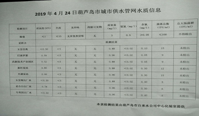 2019年4月24日葫蘆島市城市供水管網水質信息