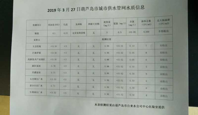 2019年3月27日葫蘆島市城市供水管網水質信息