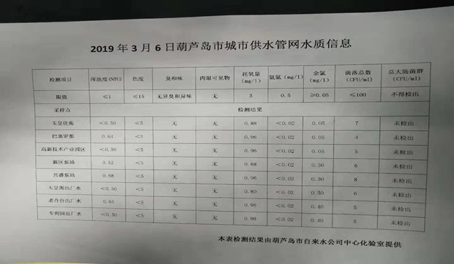 2019年3月06日葫蘆島市城市供水管網水質信息