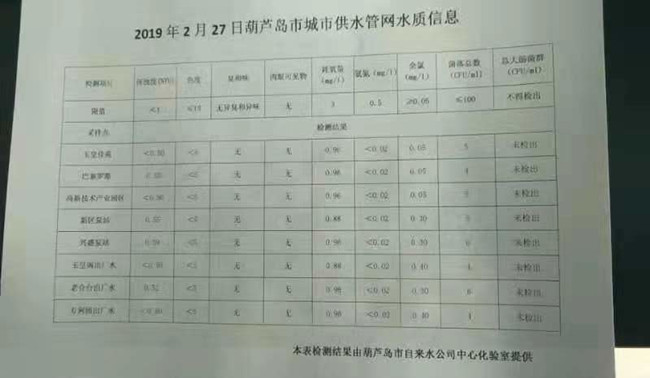 2019年2月27日葫蘆島市城市供水管網水質信息