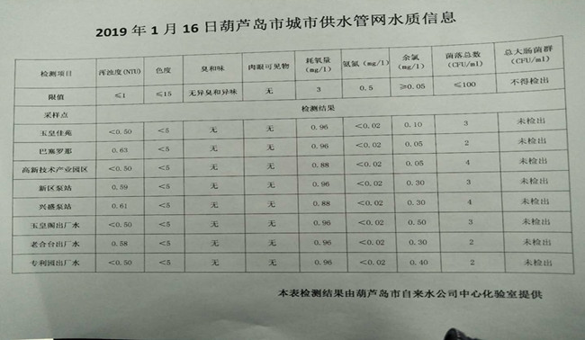 2019年1月16日葫蘆島市城市供水管網水質信息