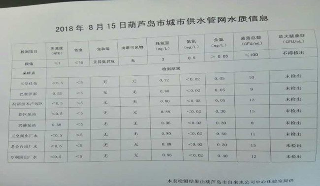 2018年8月15日葫蘆島市城市供水管網水質信息