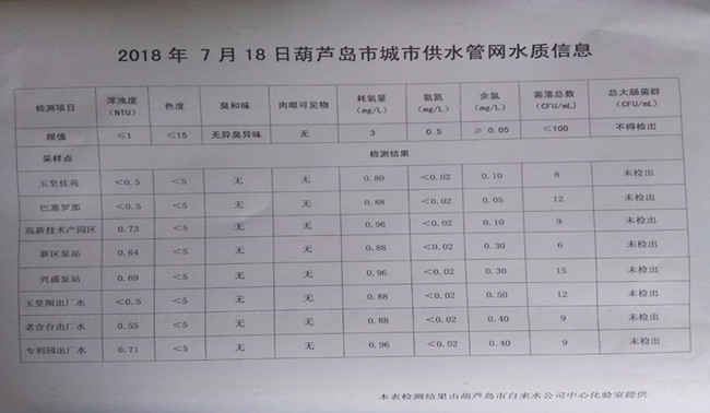 2018年7月18日葫蘆島市城市供水管網水質信息