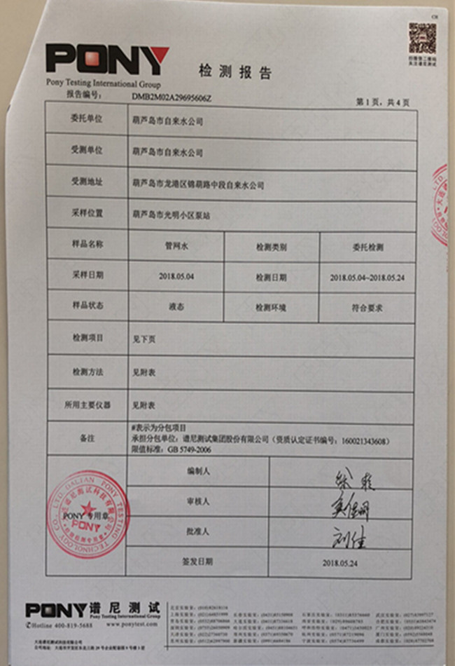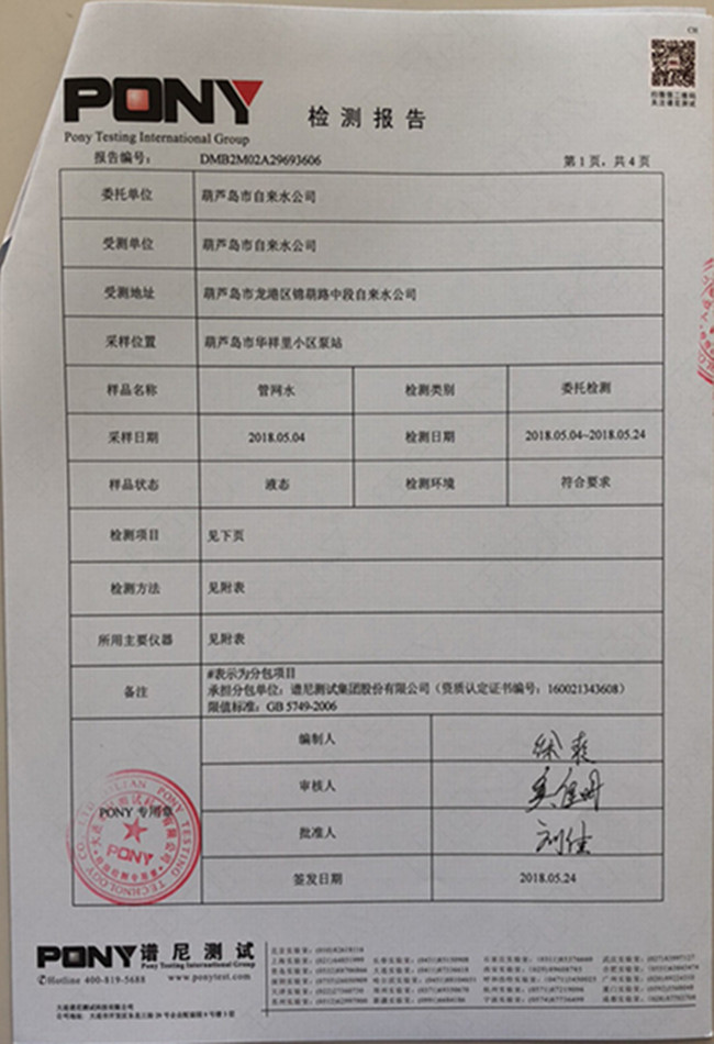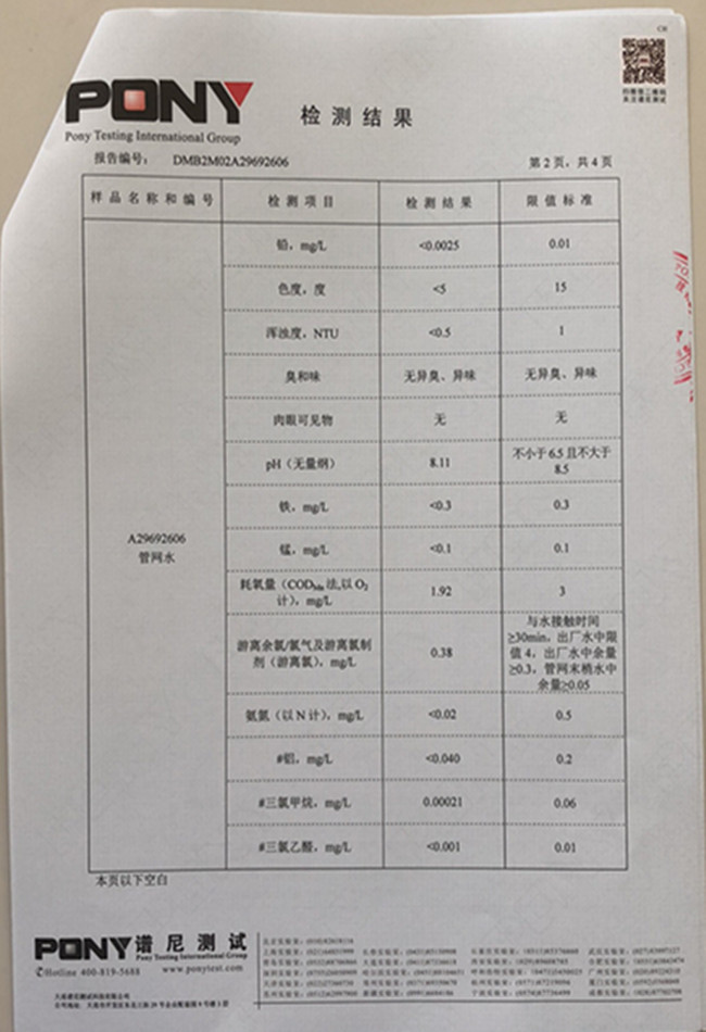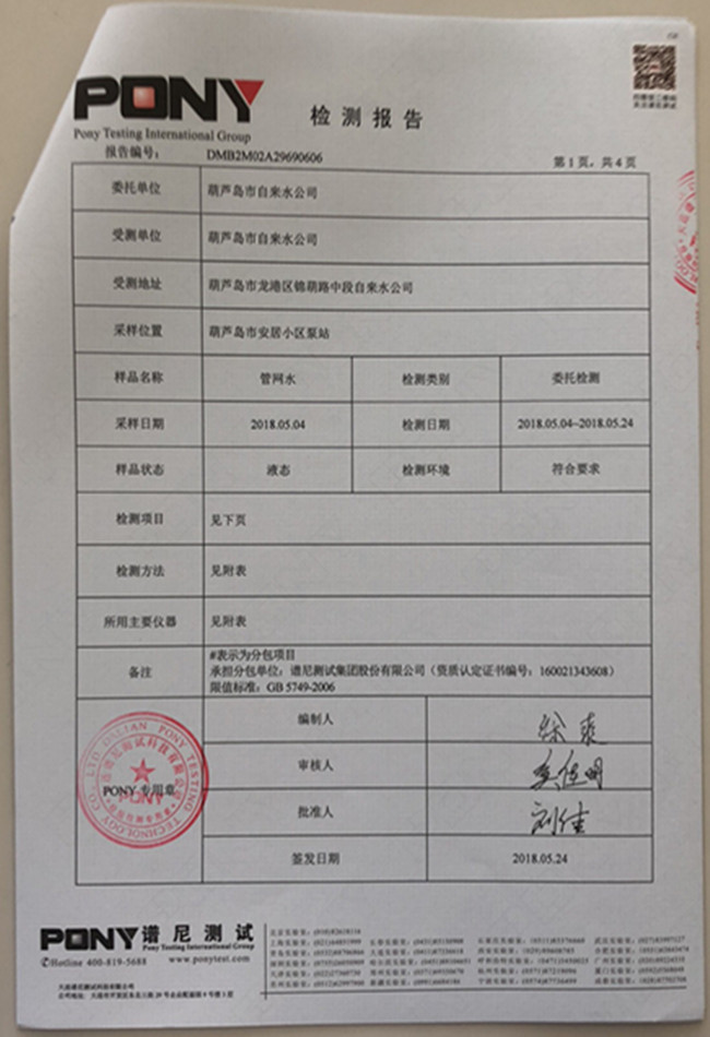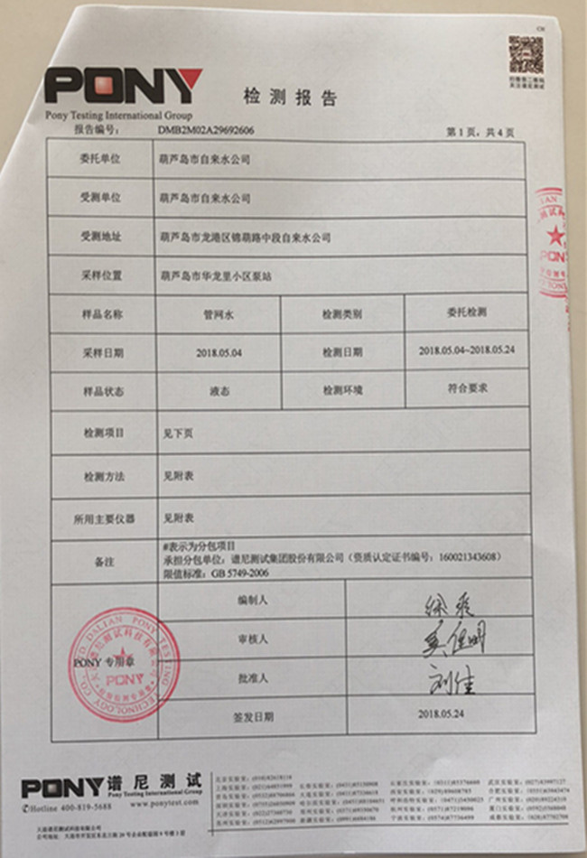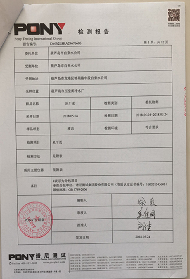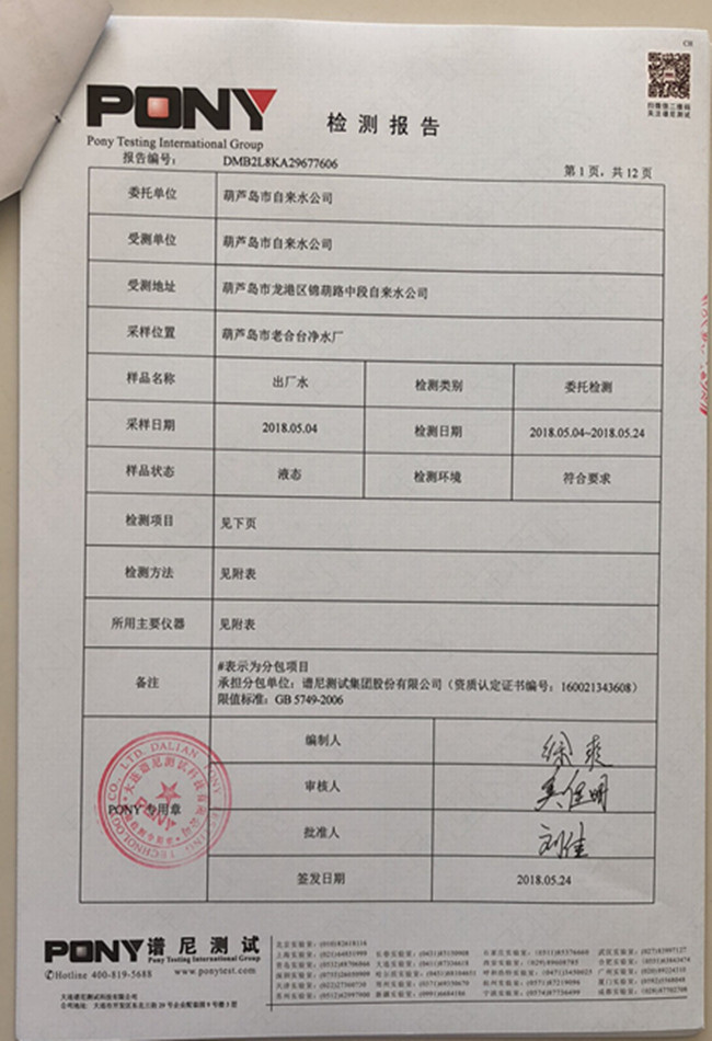 老合臺凈水廠檢測報告: