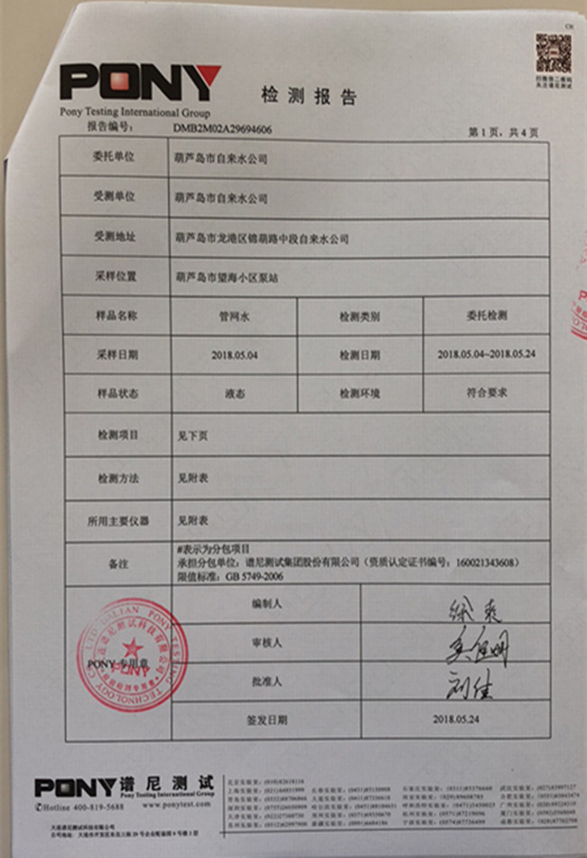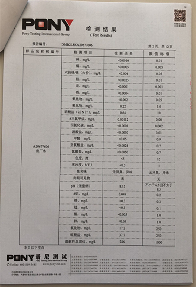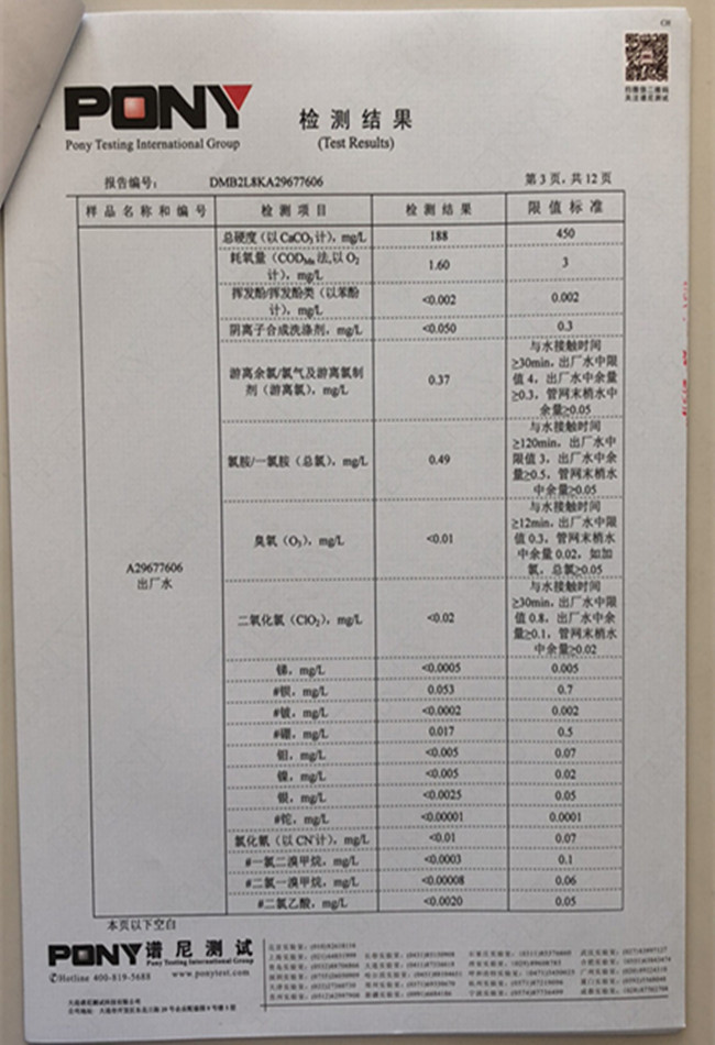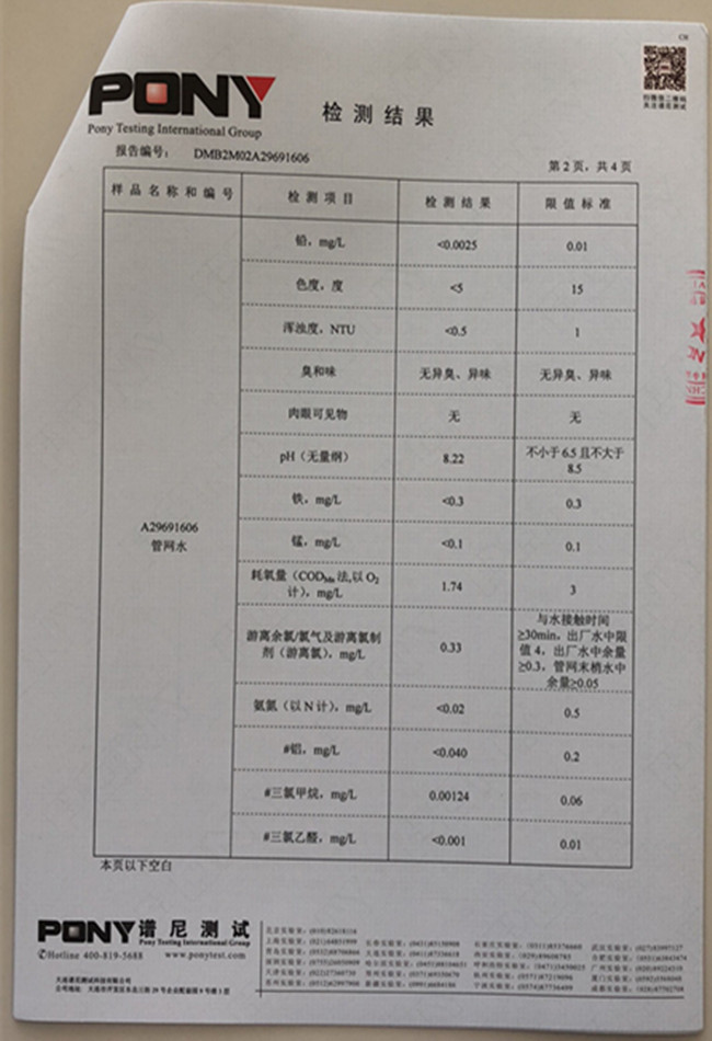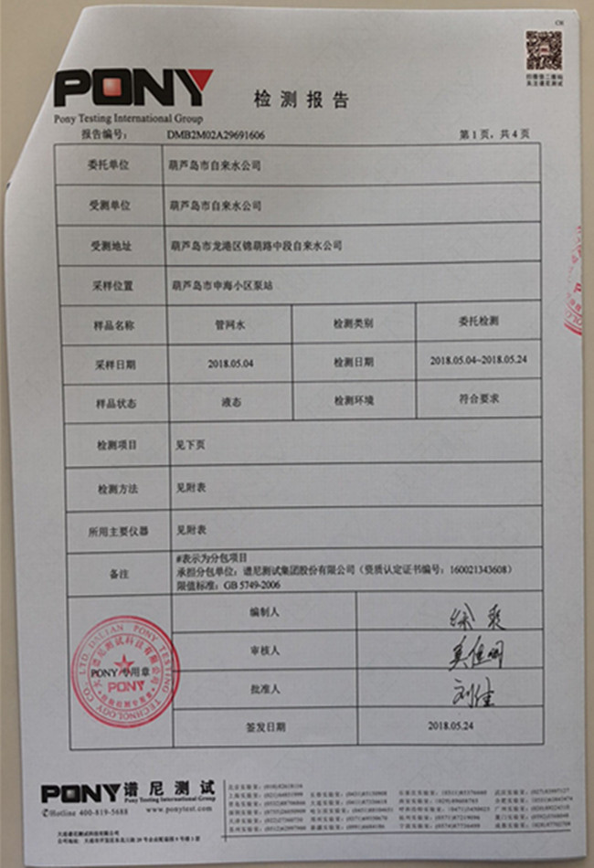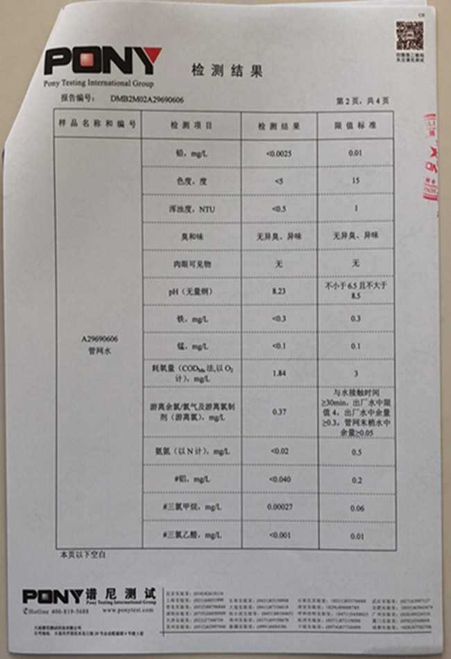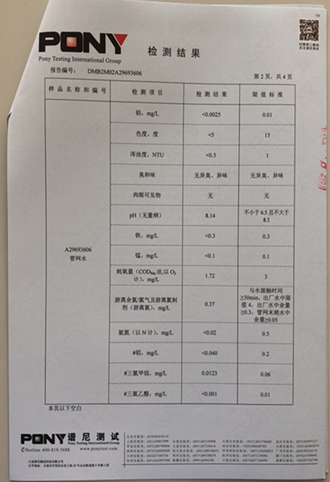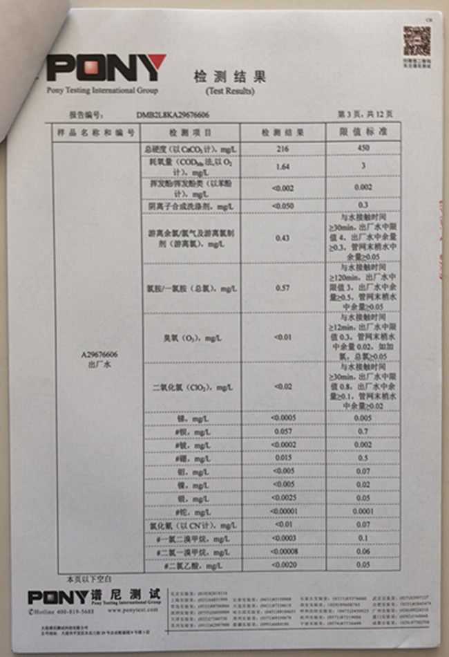 老合臺凈水廠檢測報告: