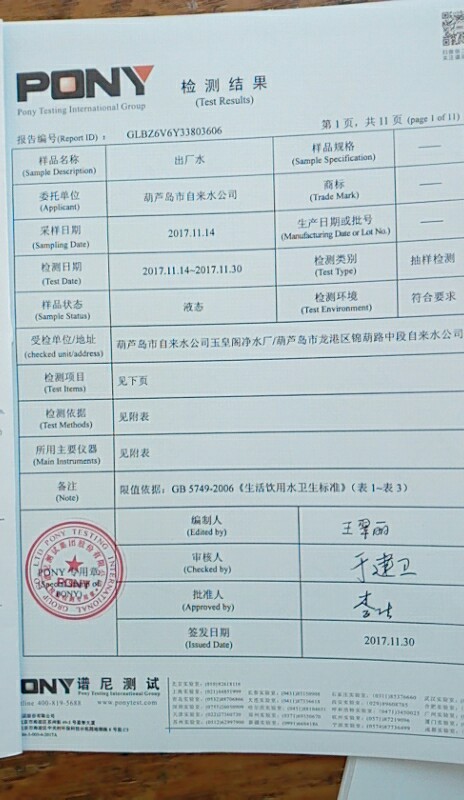 2017年11月葫蘆島市自來水公司出廠水質(zhì)信息