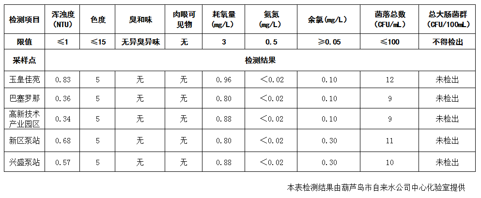 2017年3月15日葫蘆島市城市供水管網水質信息