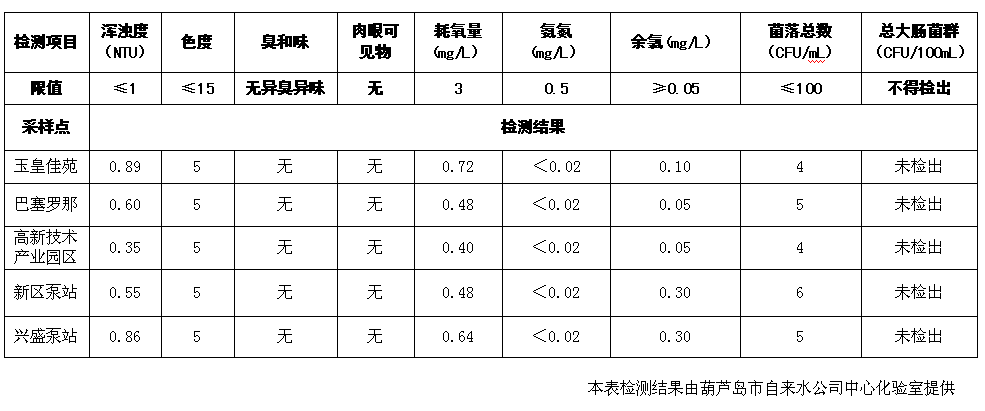 2017年1月4日葫蘆島市城市供水管網水質信息